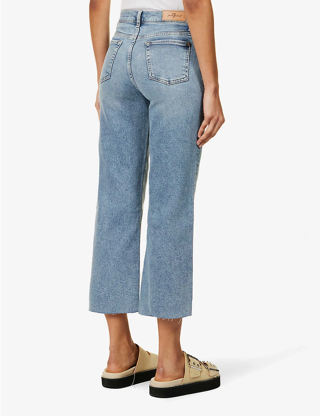 - Regular fit, mid-rise, straight leg, belt loops, five pockets, all-over faded wash, contrast stitching, V-shaped yoke at back, branded patch at back, cropped, raw cuffs