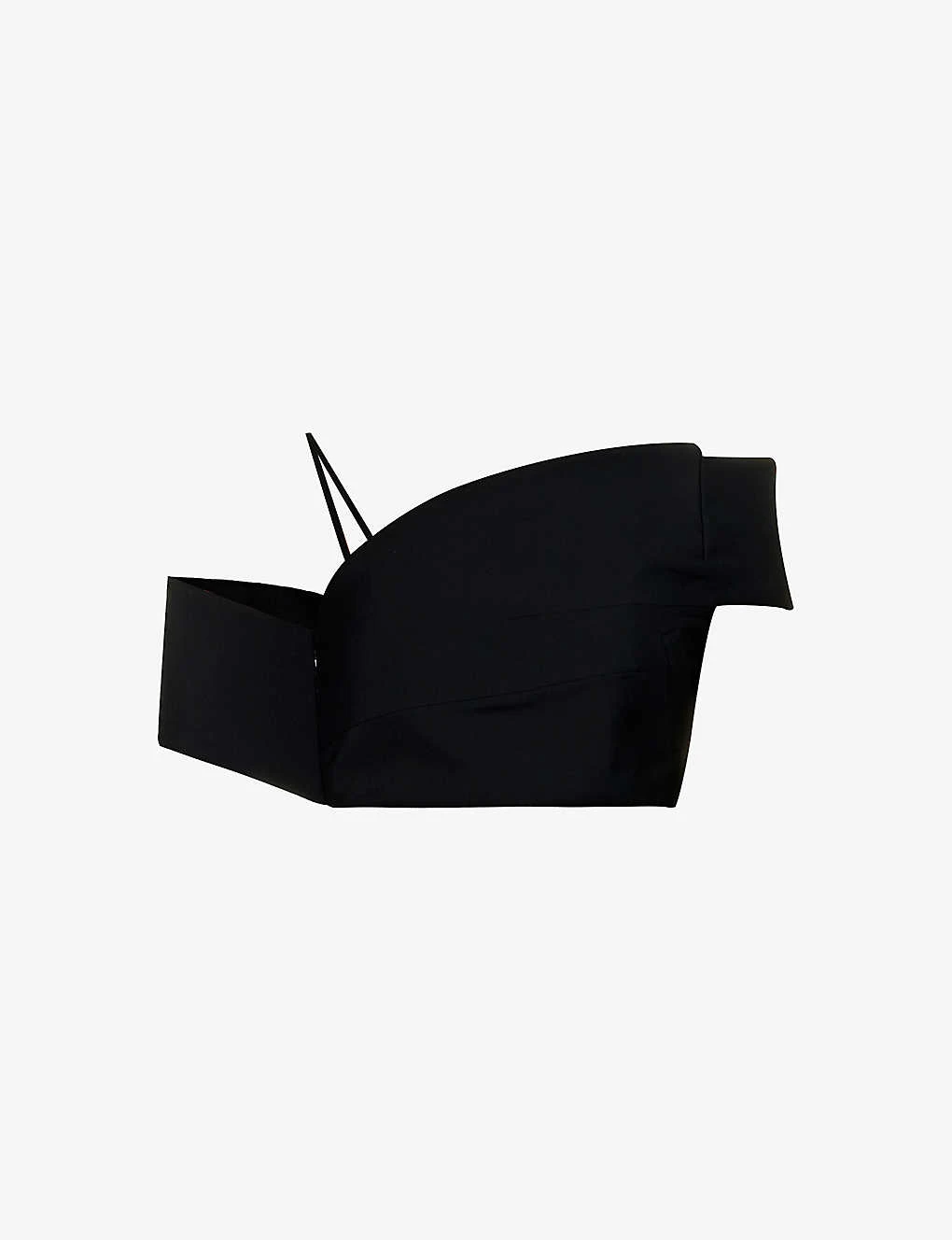 - Regular fit, asymmetric neckline, sleeveless, underwired, padded cups, angled welt pocket at front, darts at back, cropped