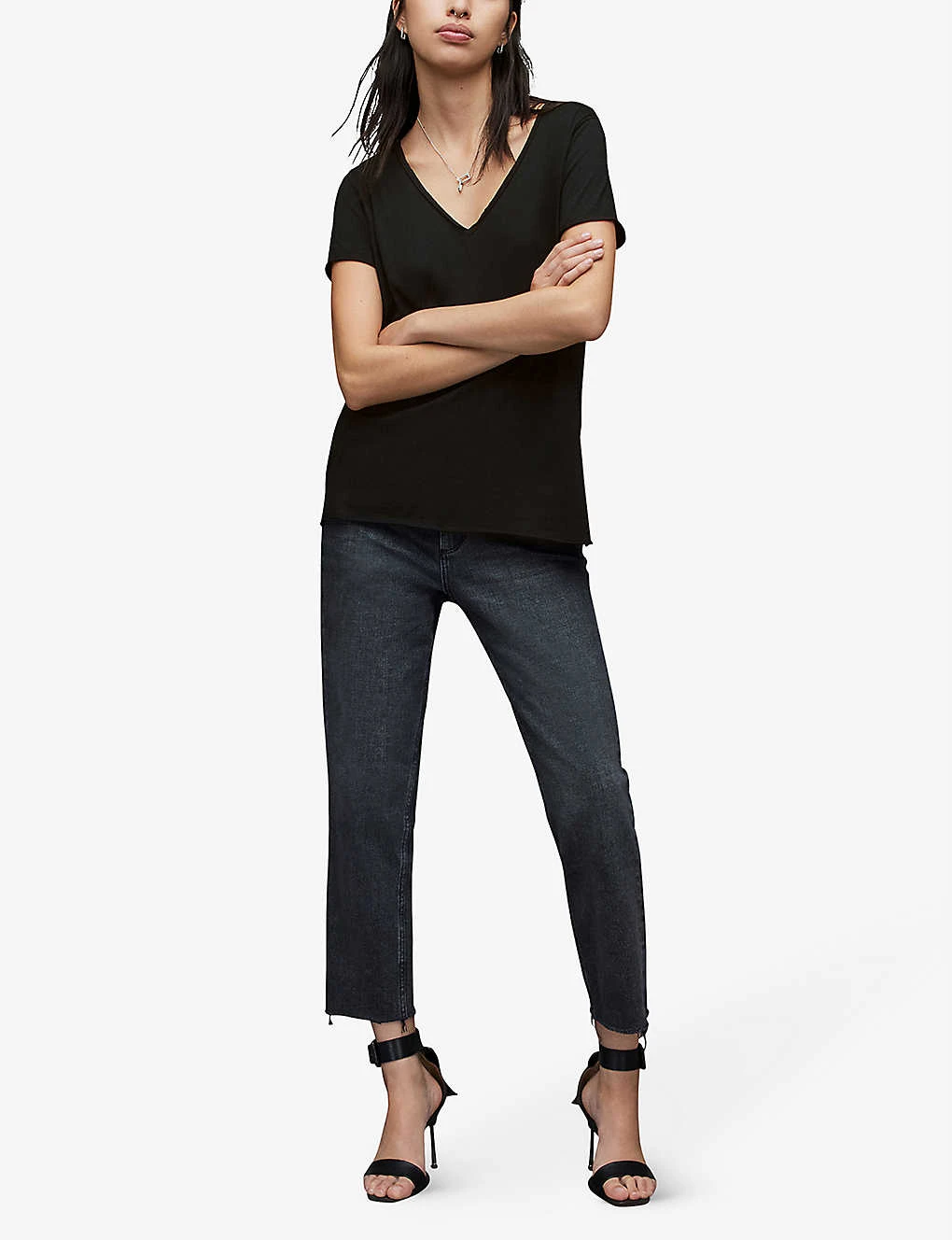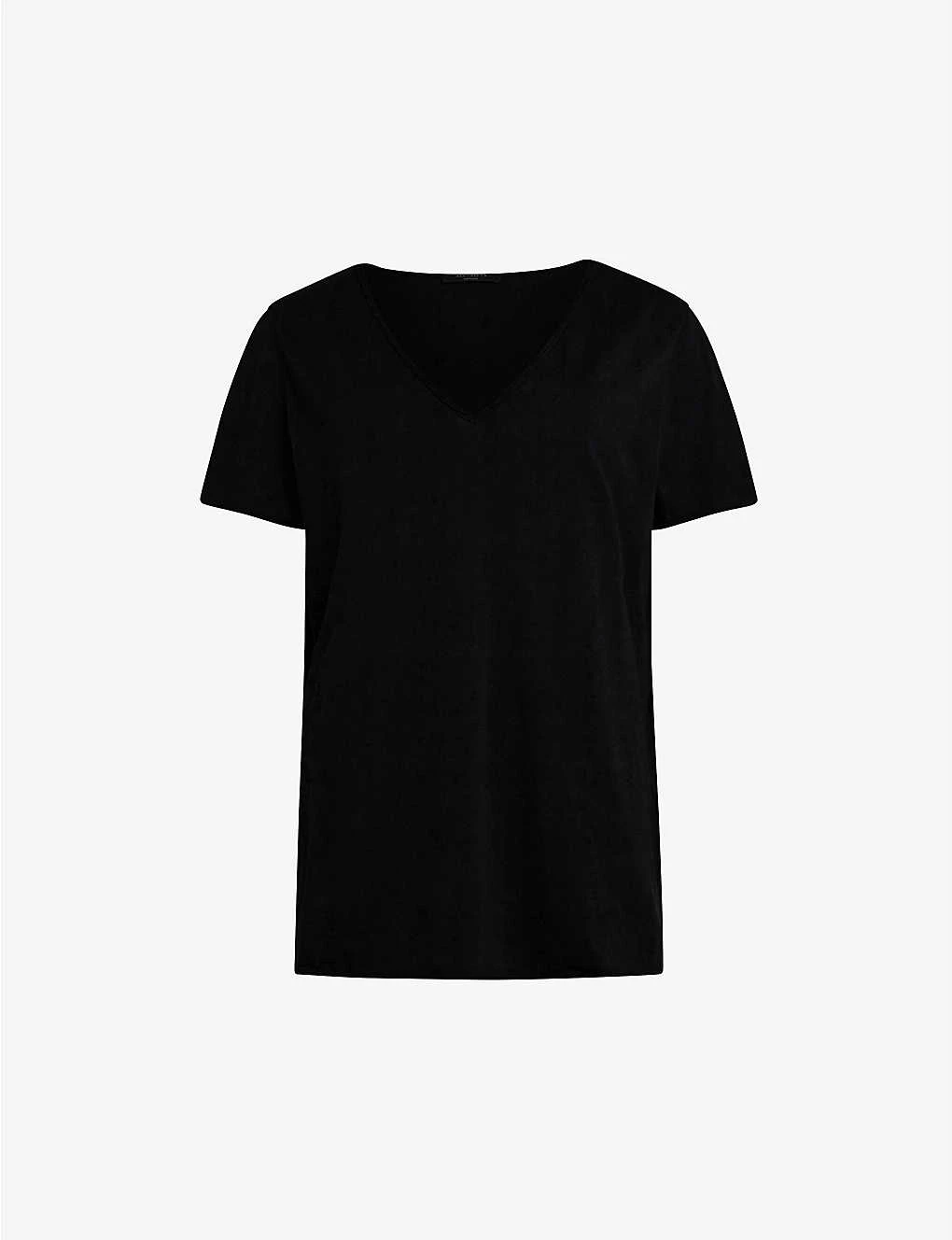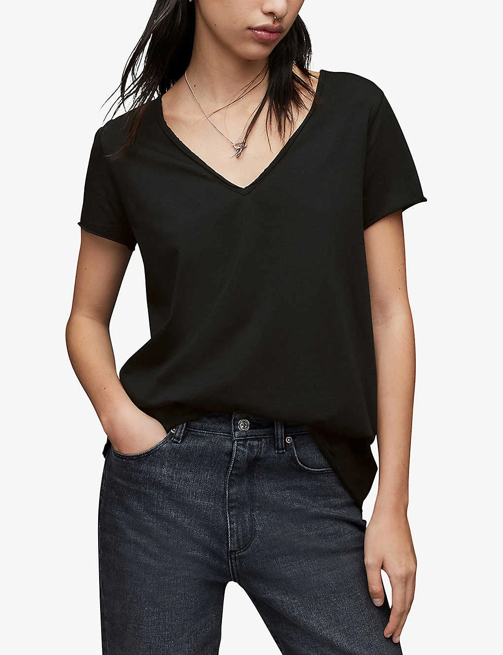 AllSaints cotton-jersey T-shirt Slips on V-neck, short sleeves, regular-fit, raw trims 100% cotton Machine wash inside out True to size Size 8: Length 28″” Model is 5ft 8″” and wears a size medium