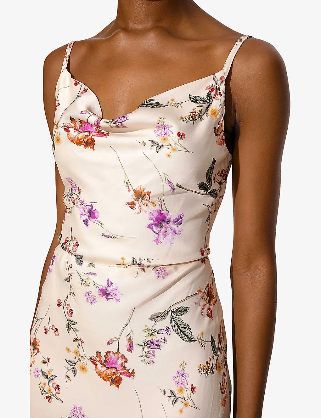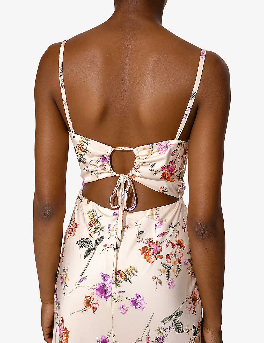 - Regular fit, spaghetti straps, tieable straps, cowl neck, all-over floral print, cut-out back