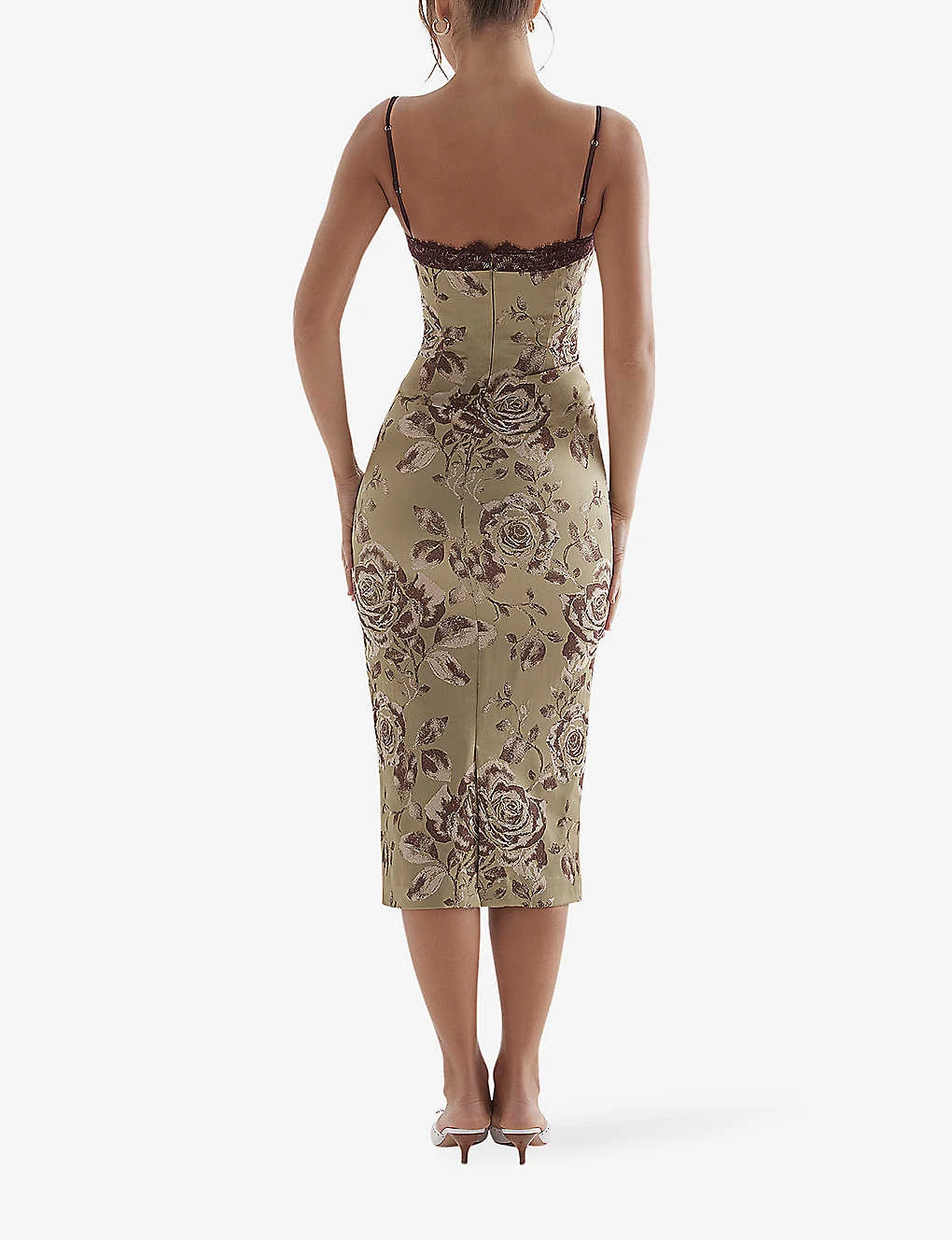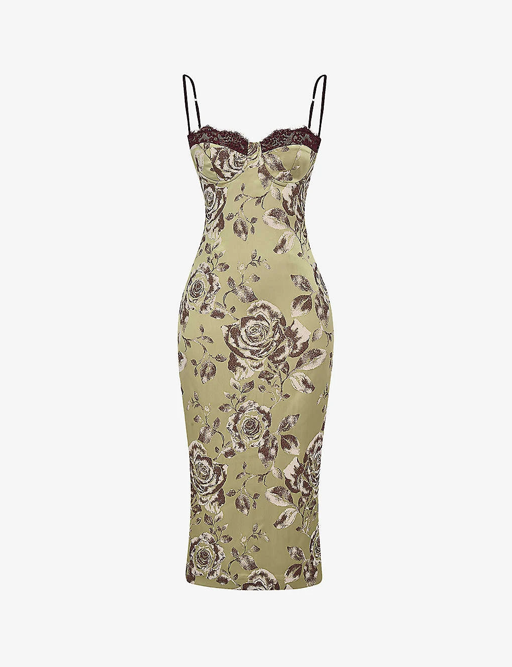 - Sweetheart neckline, adjustable straps, lace-trim at the top, bodice top, floral-print throughout, midi length, form-fitting silhouette