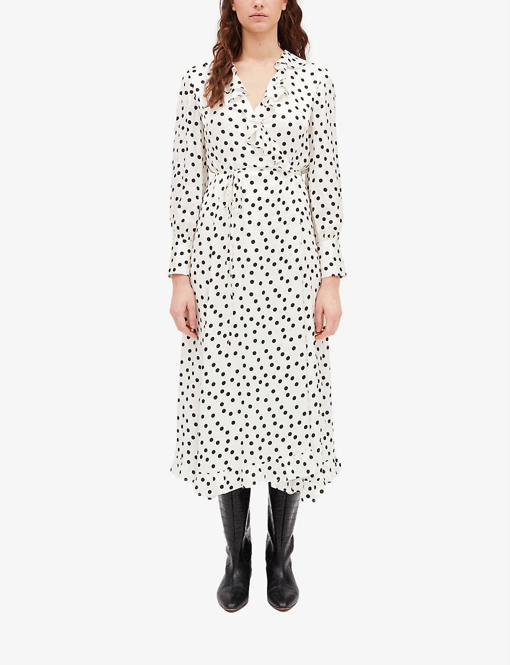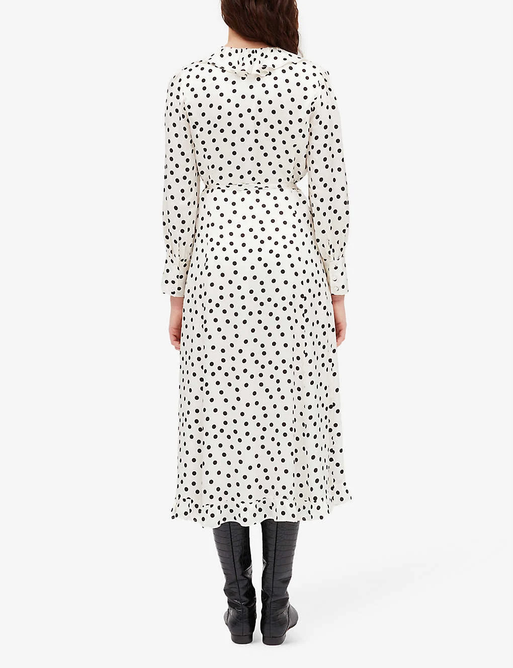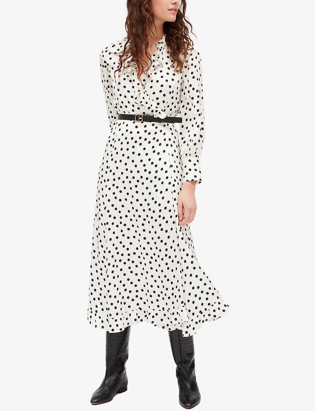 - Ruffled V-neck, long sleeves, gathered cuffs, all-over polka-dot print, wrap-over bodice, self-fastened waist belt, flared midi skirt
