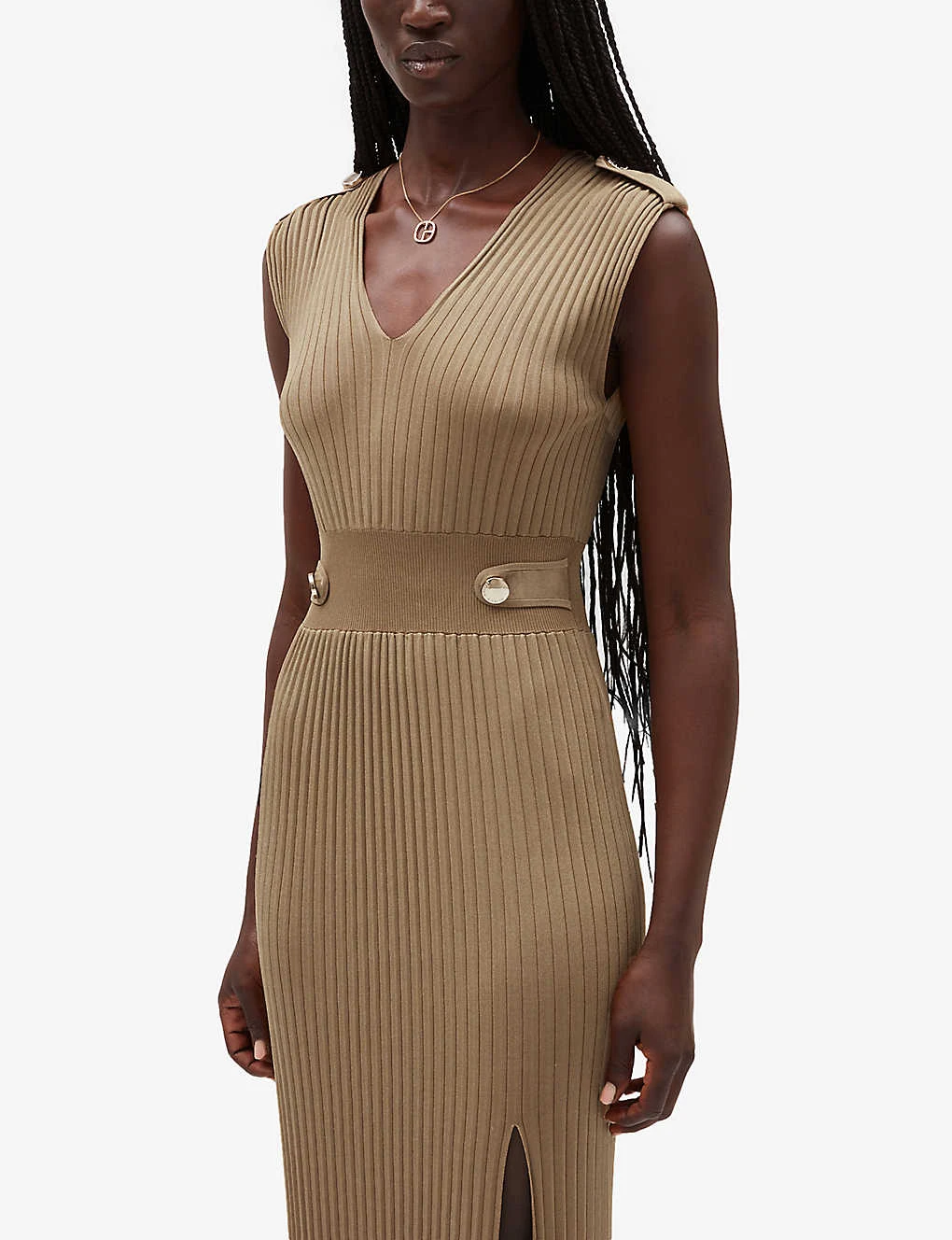 - V-neck, gold-hardware shoulder epaulettes, all-over rib knit, fitted waistband, gold-toned tabs at waist, maxi skirt, split at side hem
