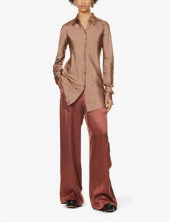 - Oversized fit, collar, dropped shoulders, long sleeves, buttoned cuffs, two buttoned flap pockets at chest, faded wash, curved split hem