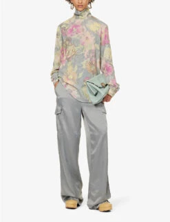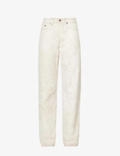 - Regular fit, mid-rise, straight leg, structured waistband with belt loops, five pockets, brand patch at back, curved yoke at back, all-over floral pattern, contrast stitching, branded hardware