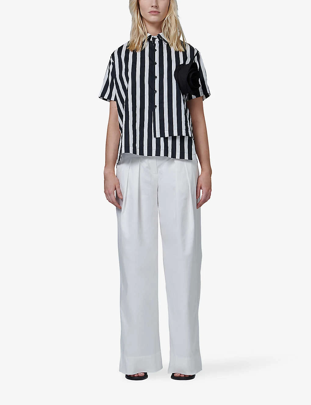 - Short sleeves, striped pattern, floral appliqué, pointed collar, asymmetric hem