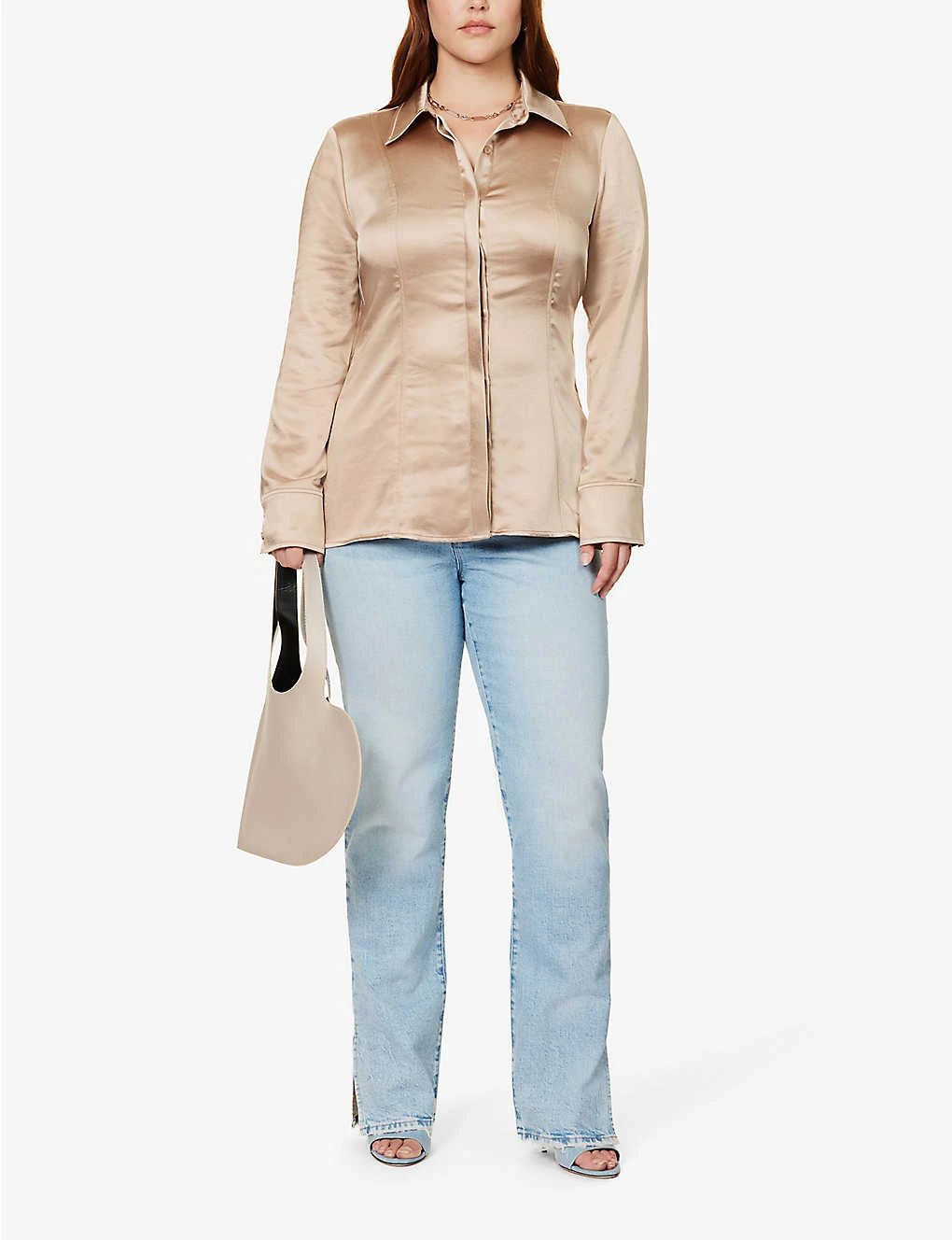 - Slim fit, collar, long sleeves, buttoned cuffs, panelled pattern, satin texture, curved hem