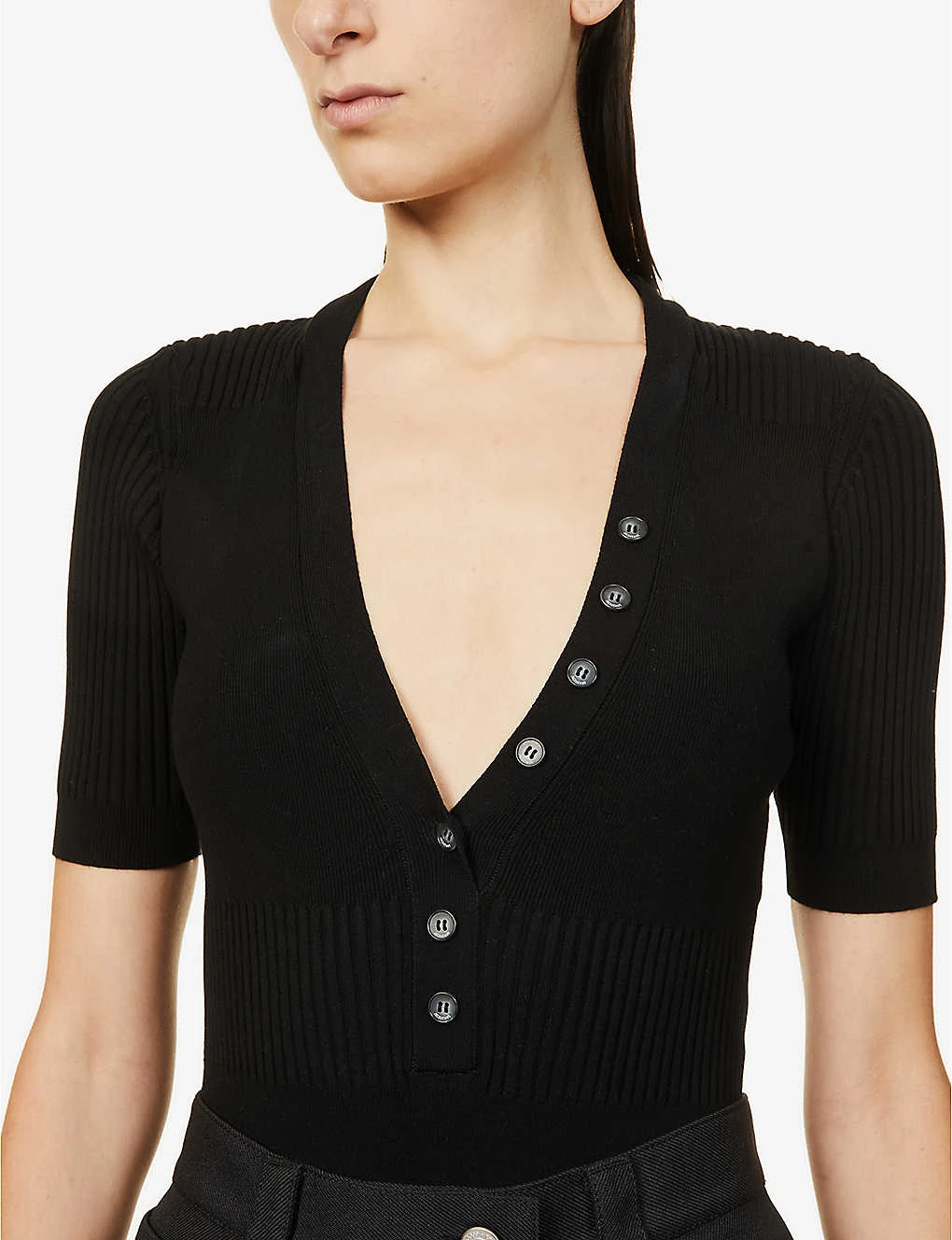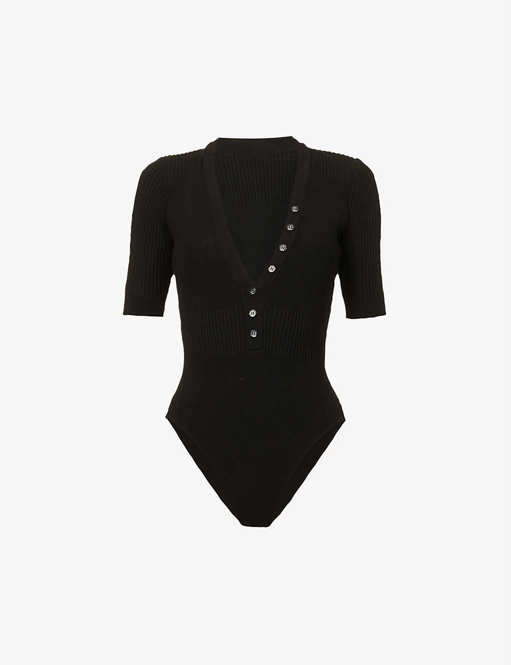 - Slim fit, high leg, collar, V-neckline, ribbed three quarter sleeves, ribbed panels, branded buttons