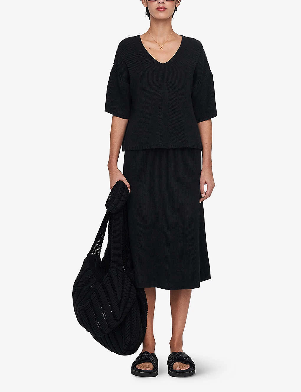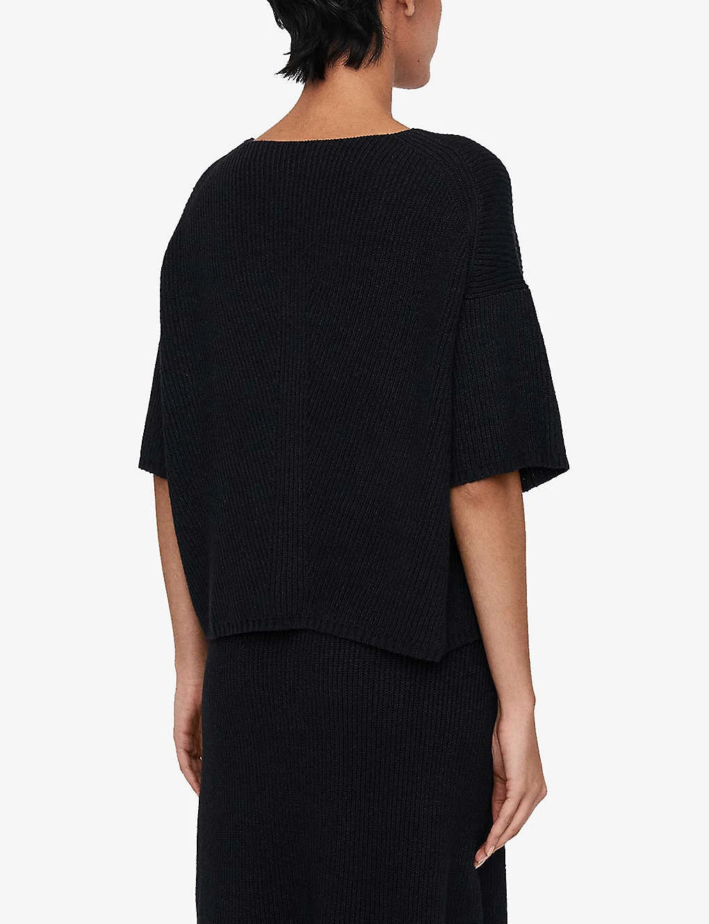 - Relaxed fit, short sleeves, V neck, dropped shoulders, knitted construction, all-over ribbed finish