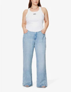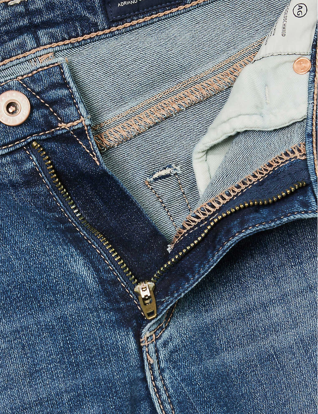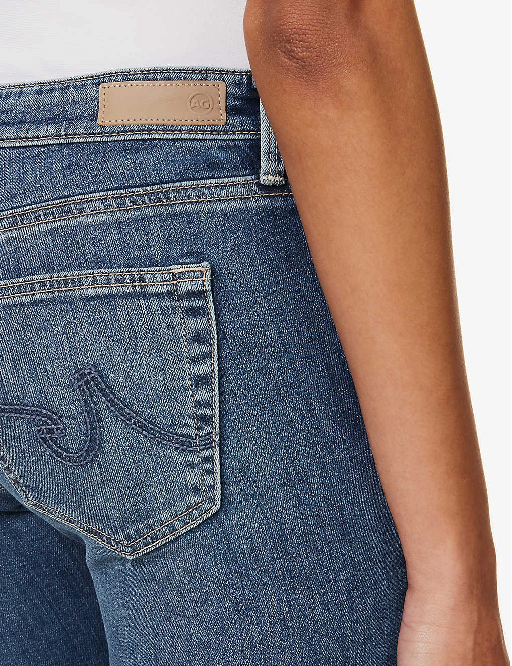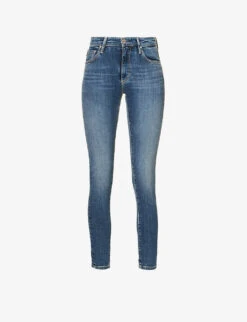 - Skinny fit, mid-rise, slim leg, structured waistband, belt loops, brand tab at front, five pockets, V-shaped yoke at back, brand patch at back, contrast stitching, mid-faded wash, branded silver-toned hardware