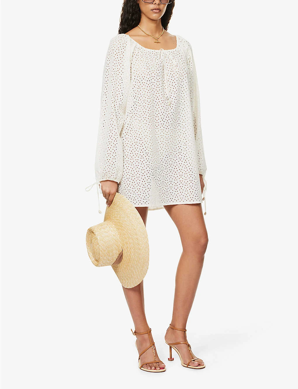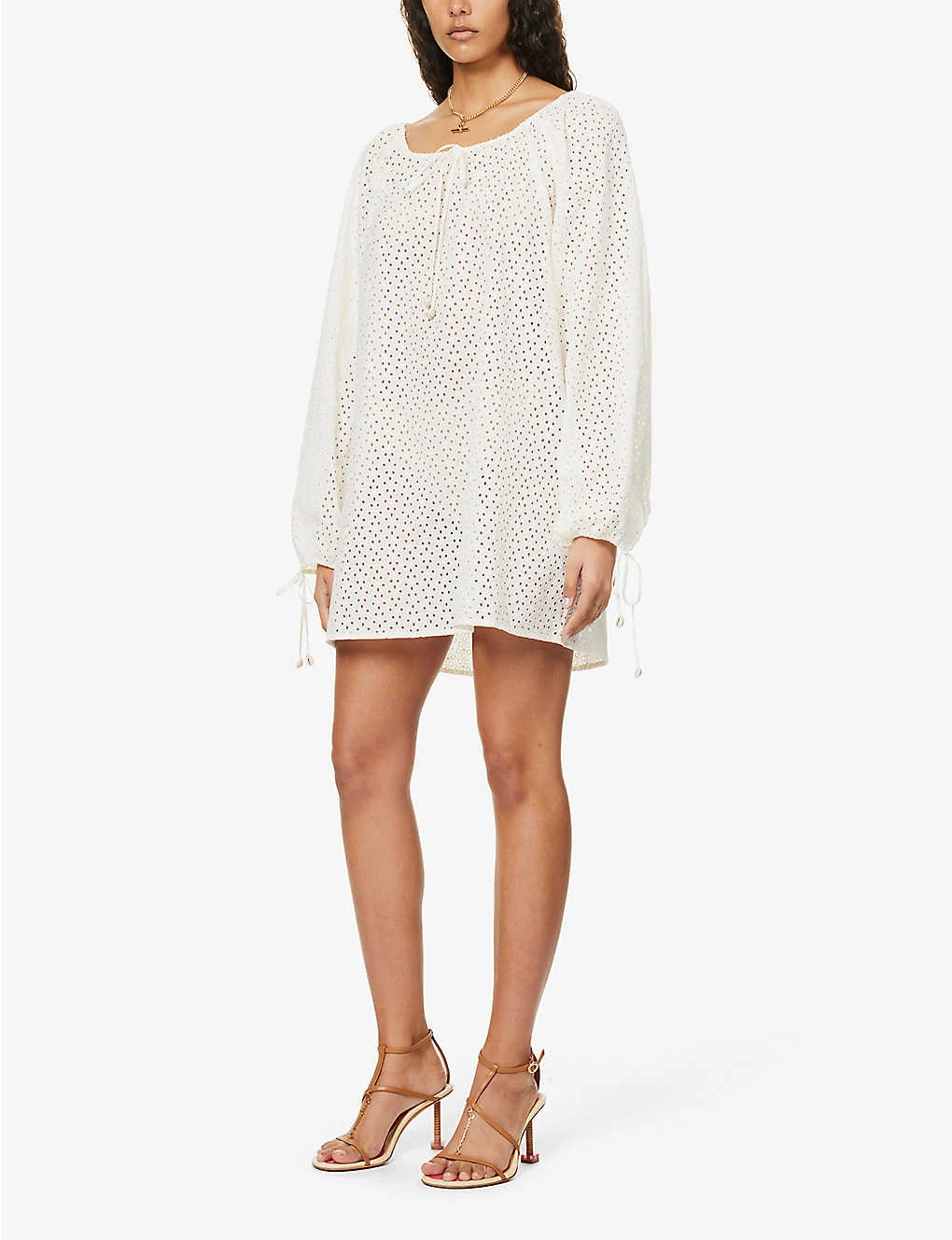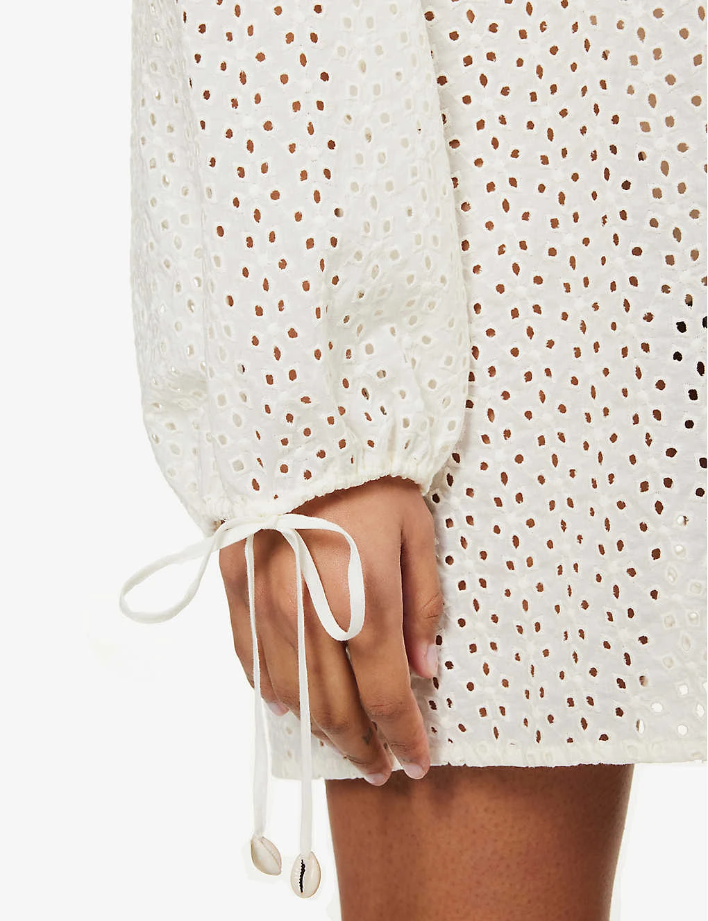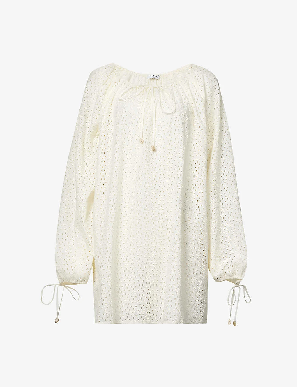 - Relaxed fit, scoop neckline, long sleeves, self-tie sleeve hems, all-over broderie pattern