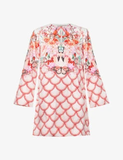 - Regular-fit, round neck, long sleeves, keyhole at chest, all-over floral and Butterfly pattern and satin texture, curved hem