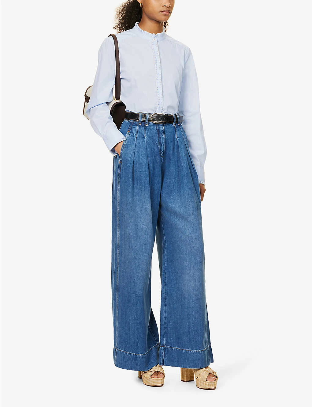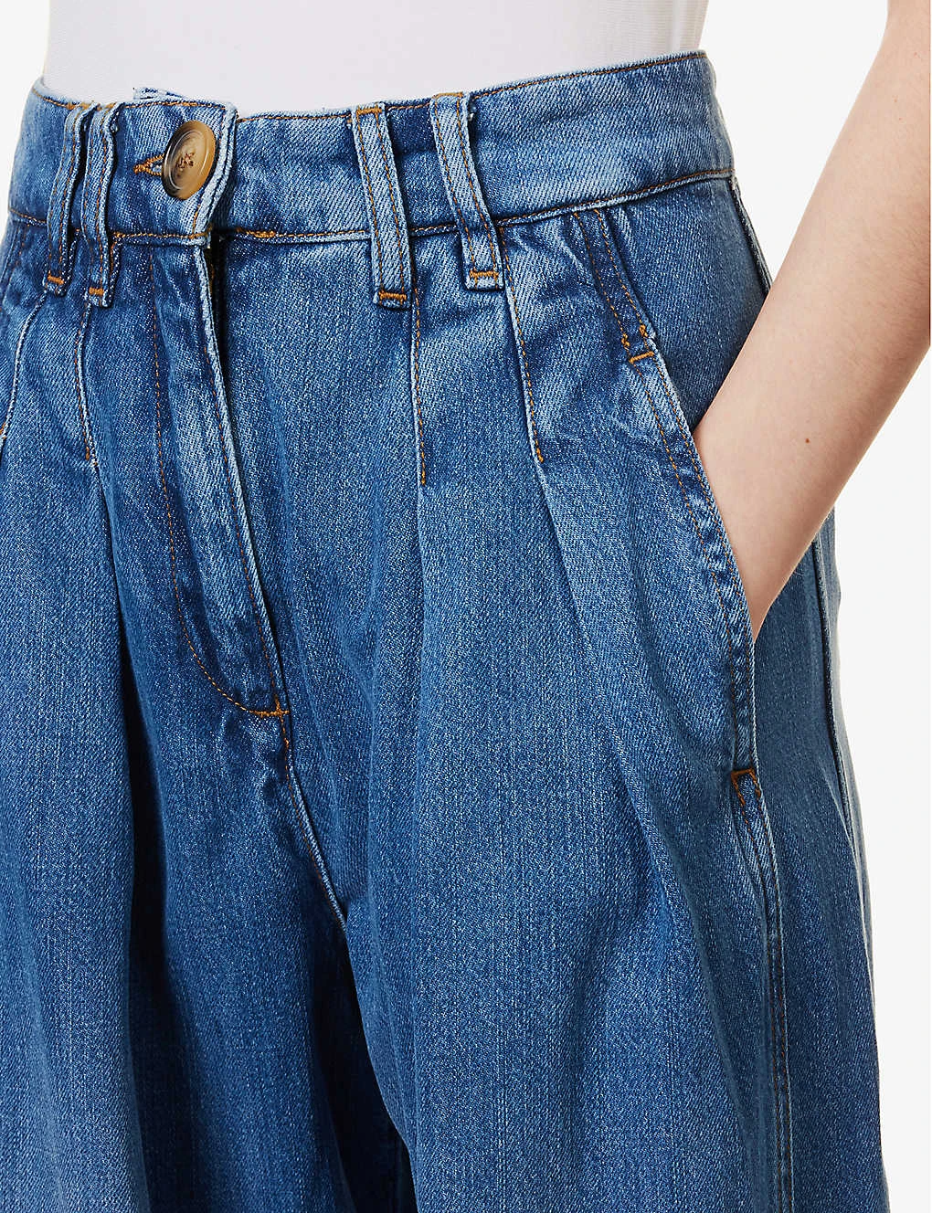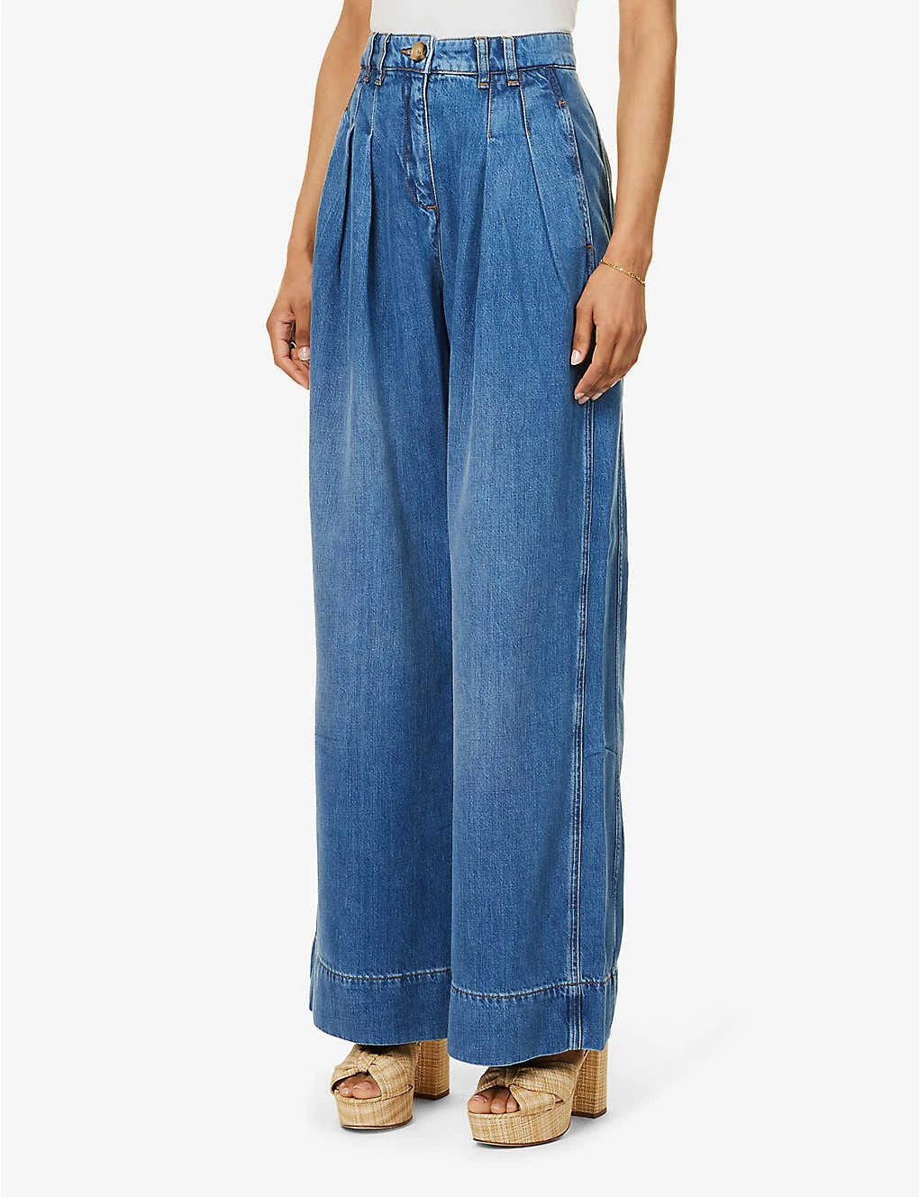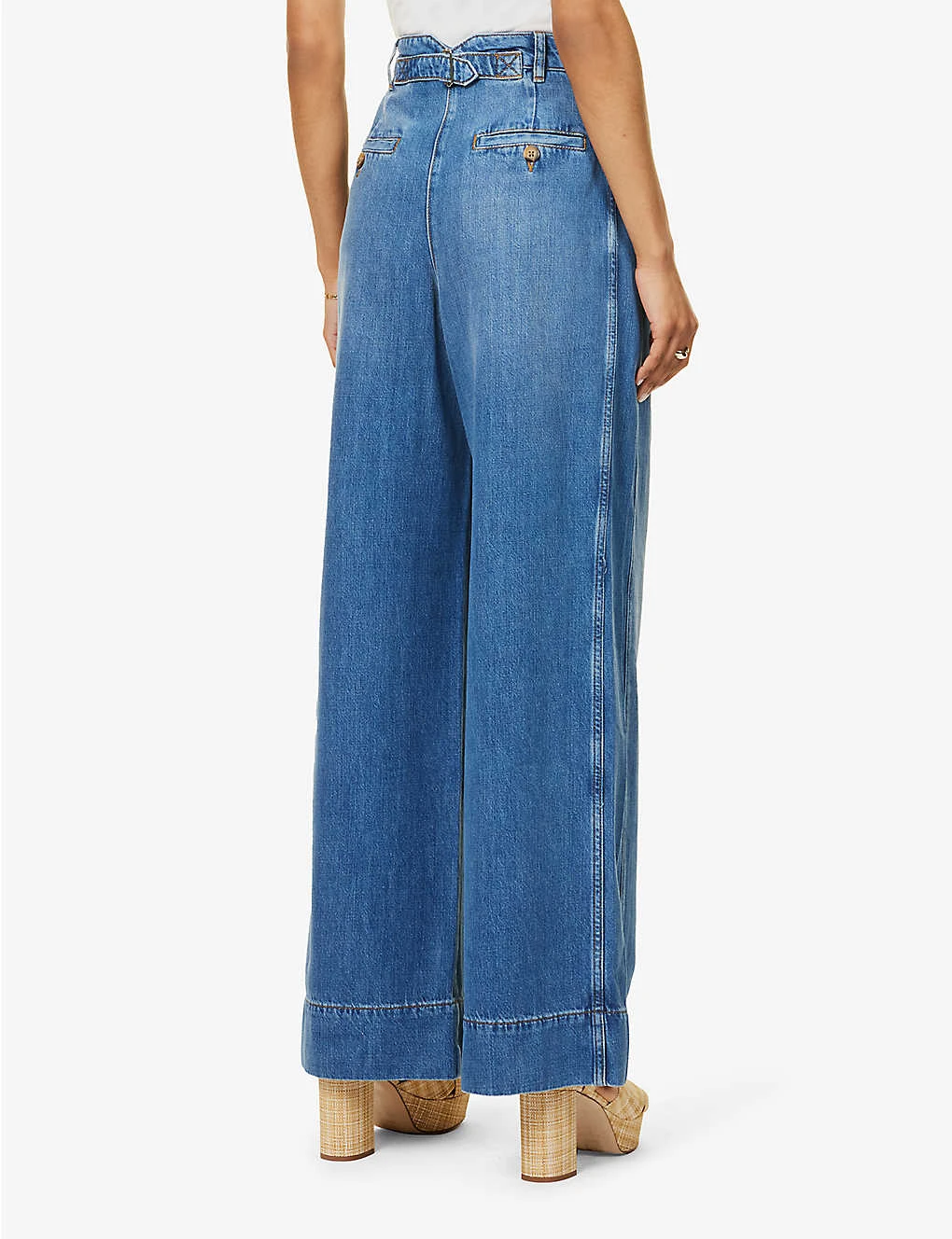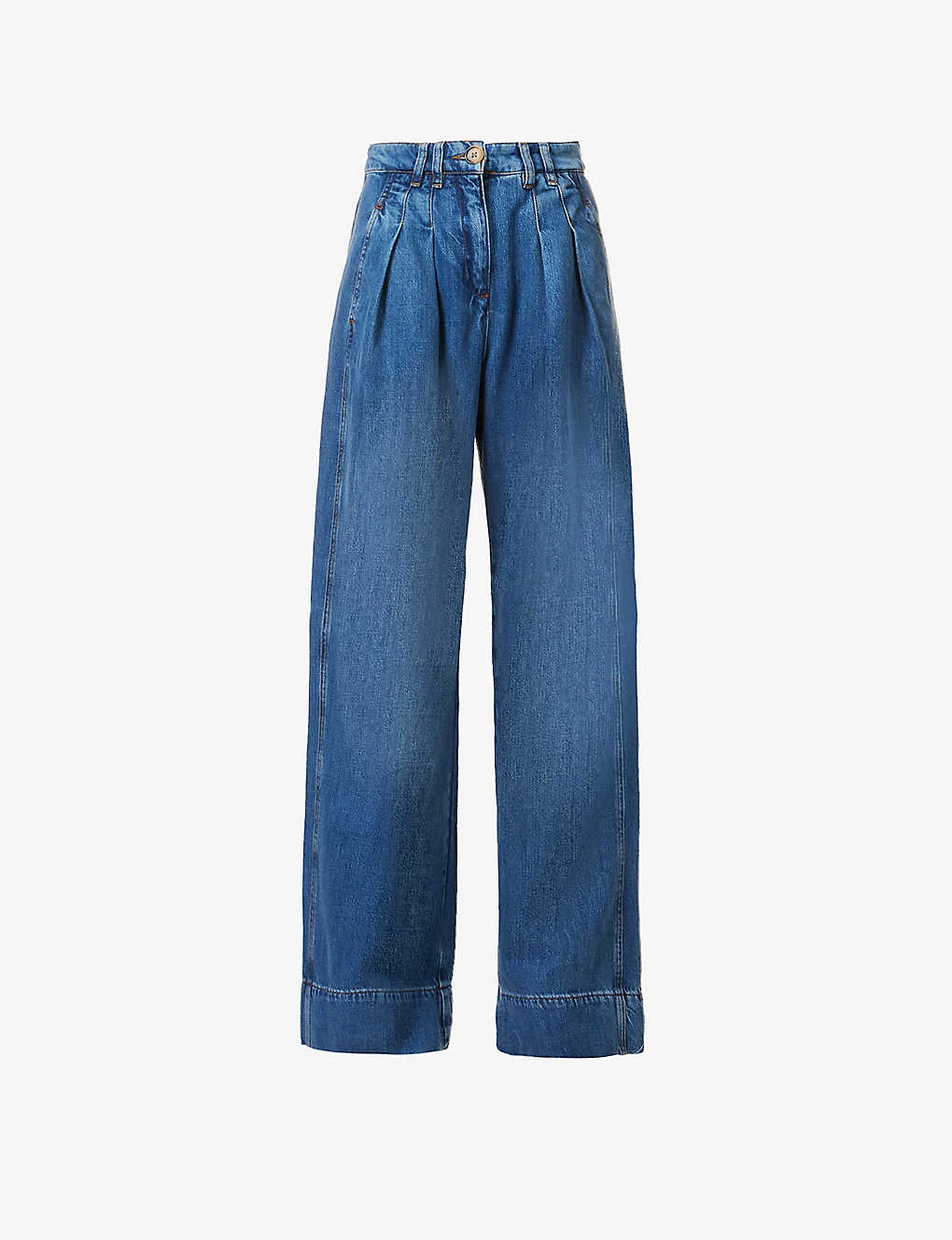 - Regular-fit, high-rise, wide leg, belt loops, two slip pockets at front, pleated panels at front, all-over faded wash, contrast stitching, darts at back, two buttoned welt pockets at back, waist-adjuster at back, gold-toned hardware, partially lined