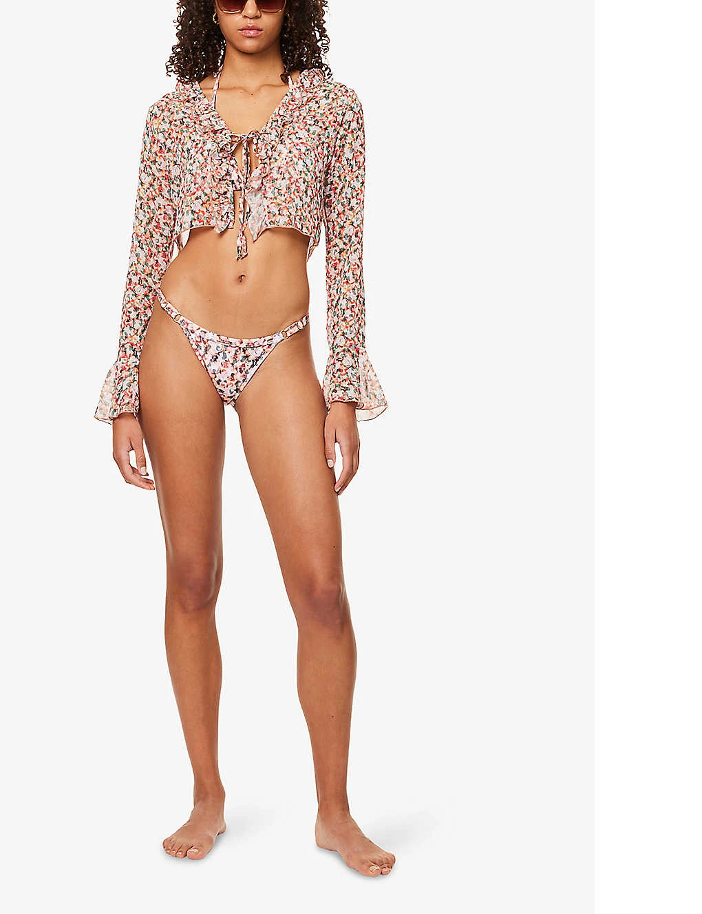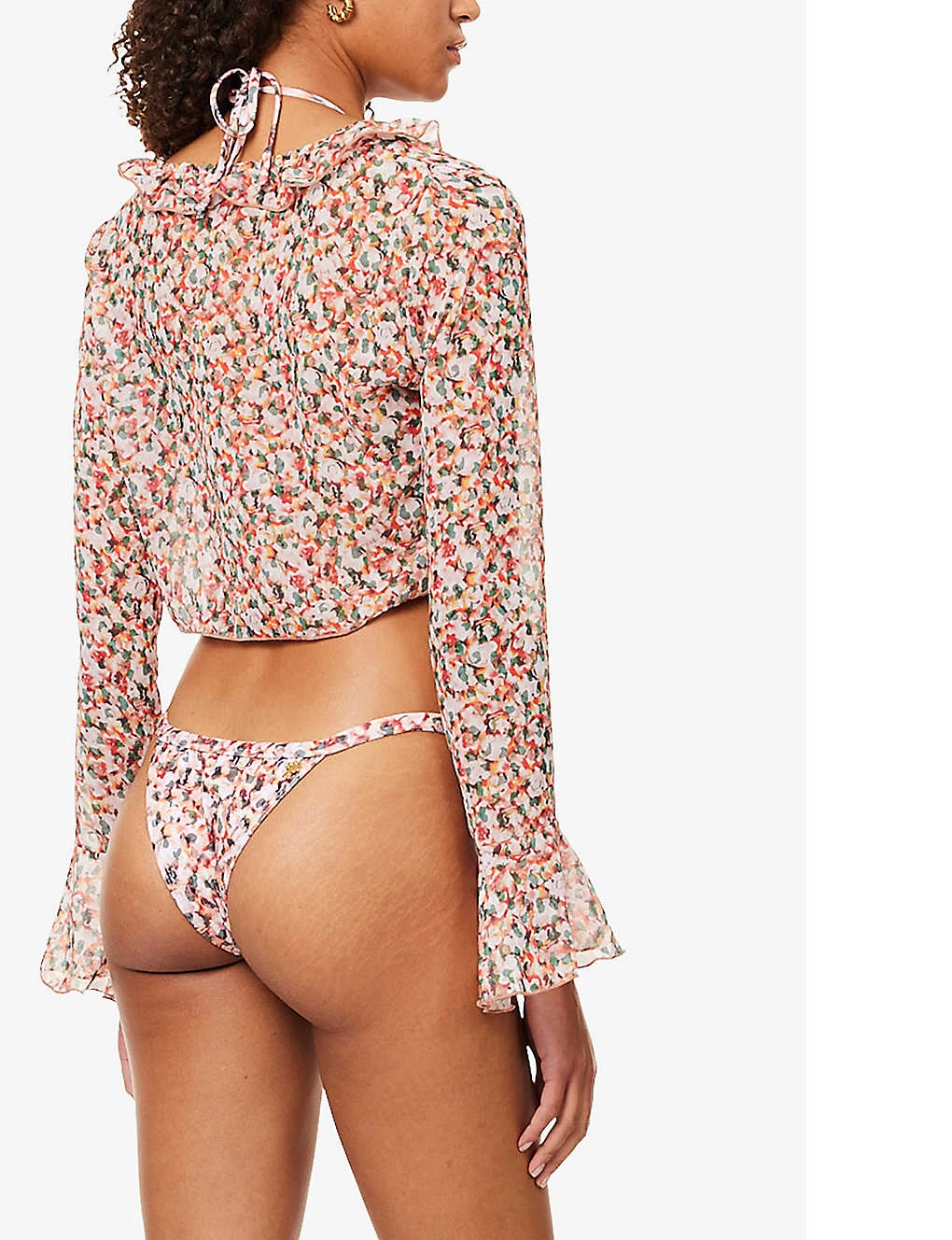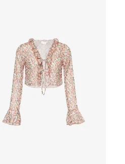 - Cropped, V-neck, long sleeves, frilled cuffs, frilled trim at neck, semi-sheer, all-over floral pattern