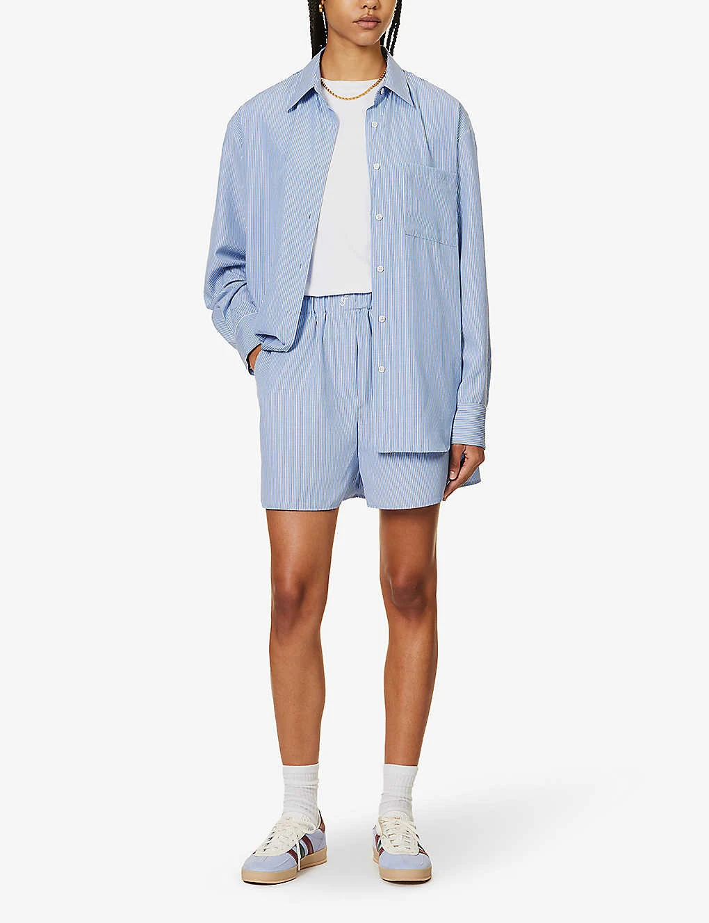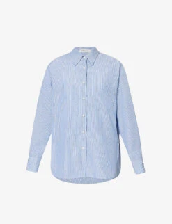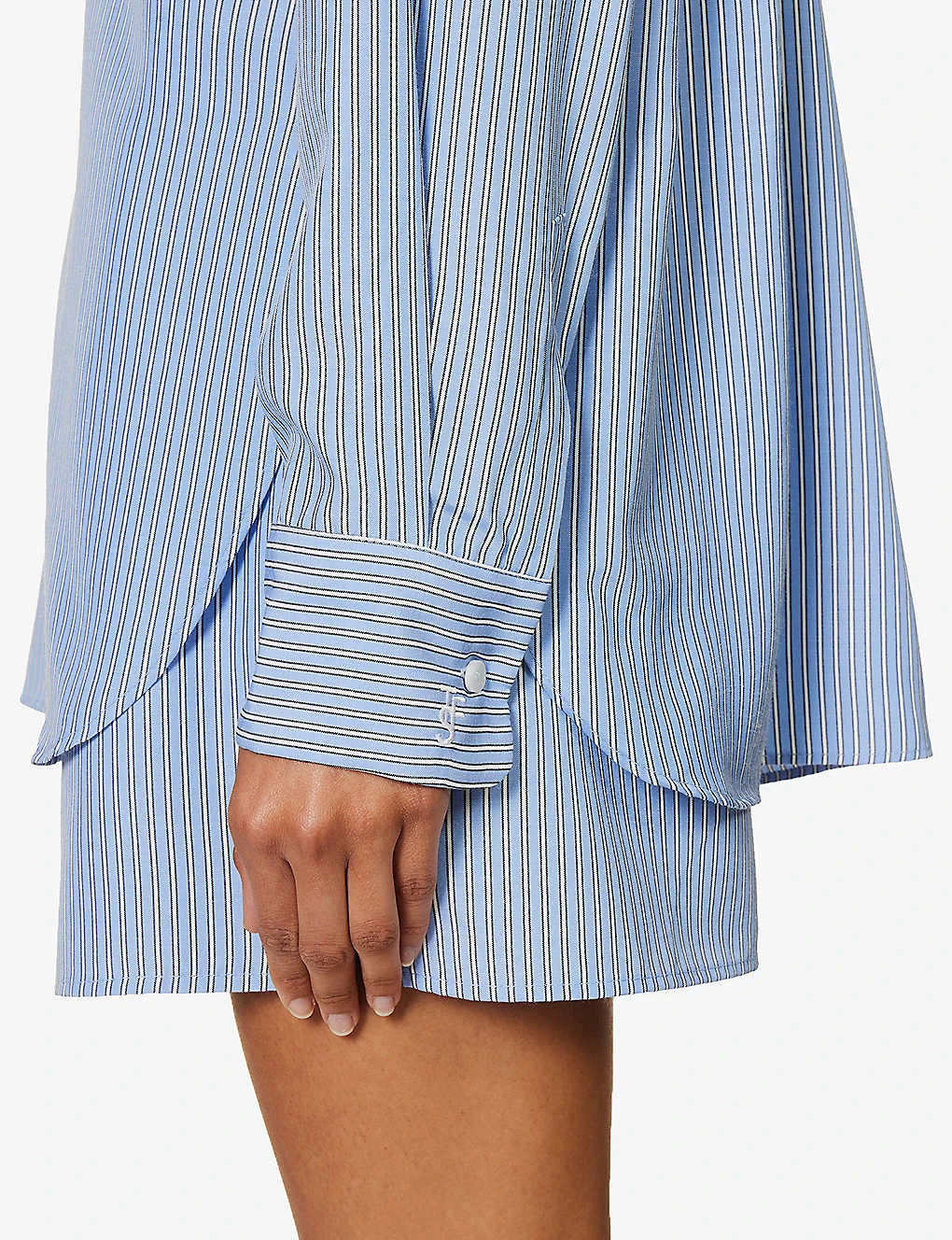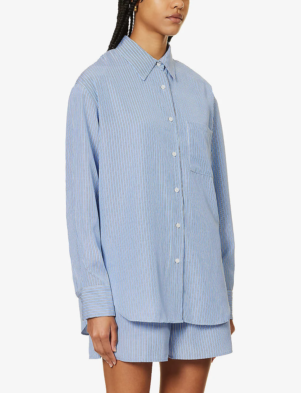 - Relaxed fit, collar, long sleeves, buttoned cuffs, embroidered branding at cuffs, patch pocket at chest, all-over stripe pattern, curved hem