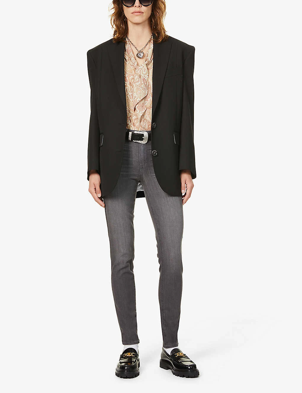 - Slim-fit, high-rise, skinny, belt loops, five pockets, branded silver-toned hardware, all-over faded wash and whiskering, embroidered brand patch at back, wide V-shaped yoke at back, partially lined
