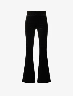 - Regular-fit, high rise, flared leg, two slip pockets at front, all-over velour texture, embroidered brand patch at back, darts at back, partially lined