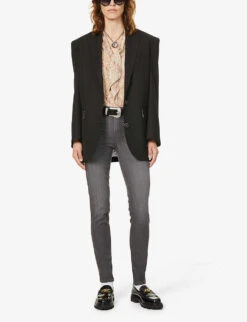 - Slim-fit, high-rise, skinny, belt loops, branded silver-toned hardware, five pockets, all-over faded wash and whiskering, contrast stitching, debossed brand patch with patent texture at back, V-shaped yoke at back, partially lined
