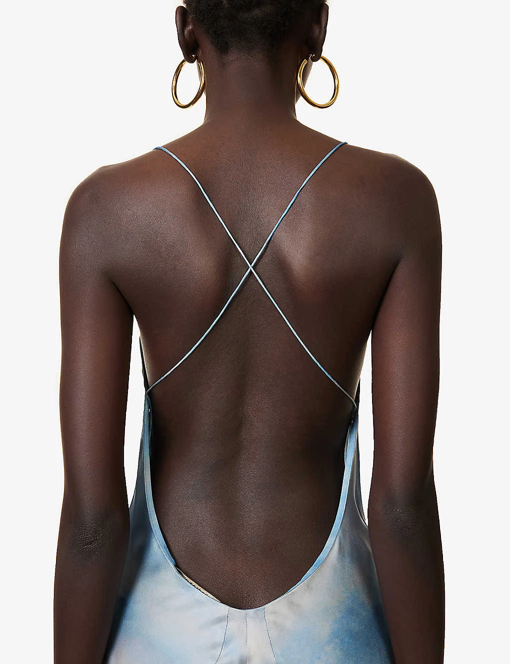 - Regular fit, round neckline, sleeveless, cross-over doubled straps, low open back, graphic pattern with brand text, asymmetric flared hem