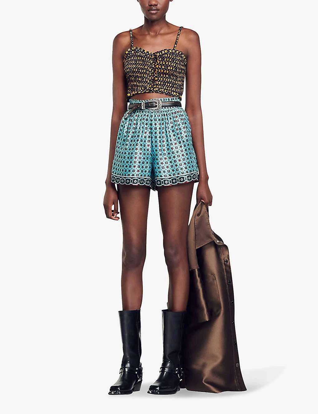 Sandro Carlito Graphic-print Smocked-bodice Cropped Woven Top
