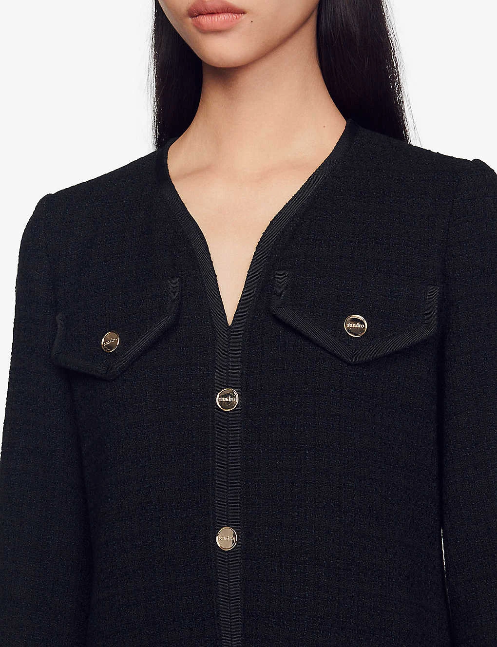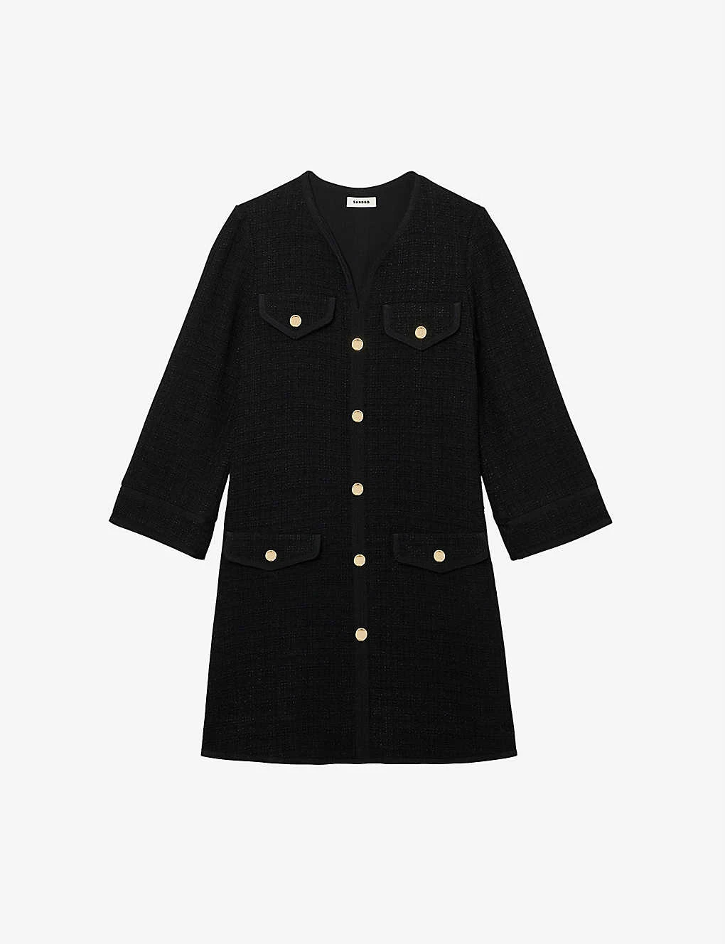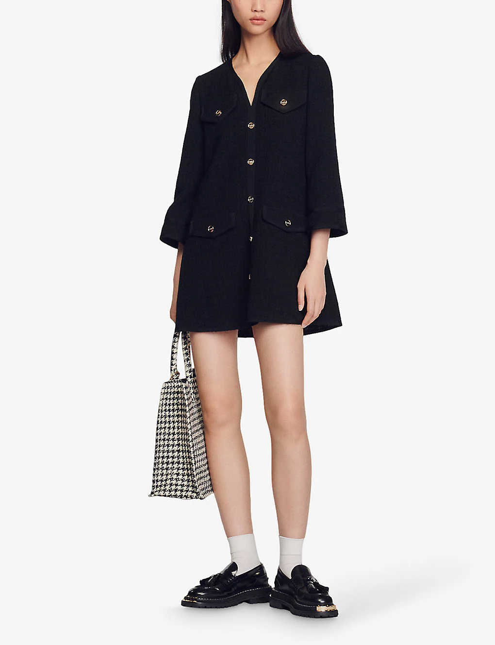 - V-neck, 3/4-length sleeves, flap pockets at the chest and hips, gold-tone hardware, mini length