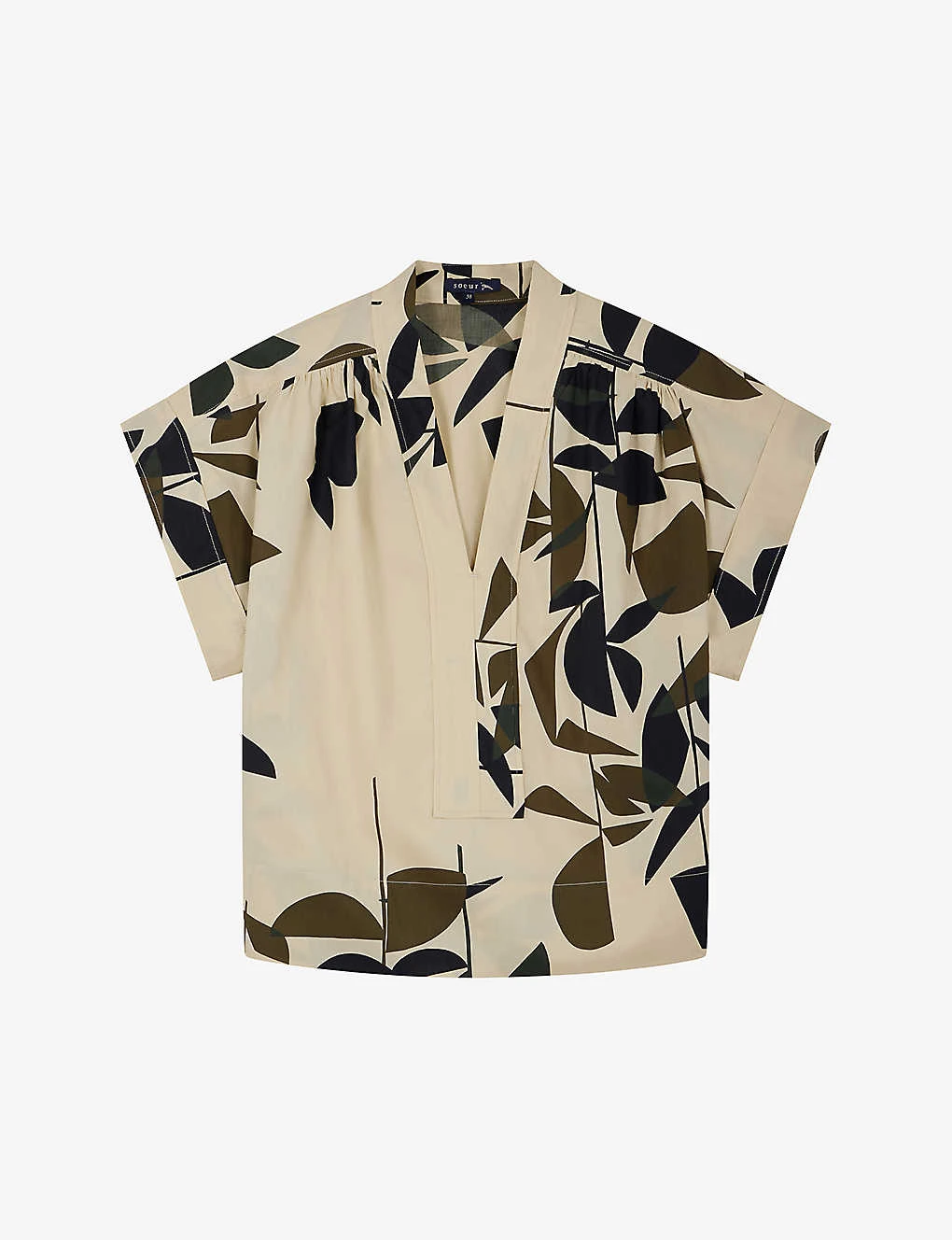 SOEUR cotton blouse100% cottonSlips onRelaxed fit, short sleeves, V-neck, gathered shoulder yokes, side slits, graphic print throughoutMachine wash coldTrue to sizeMidweight, non-stretch