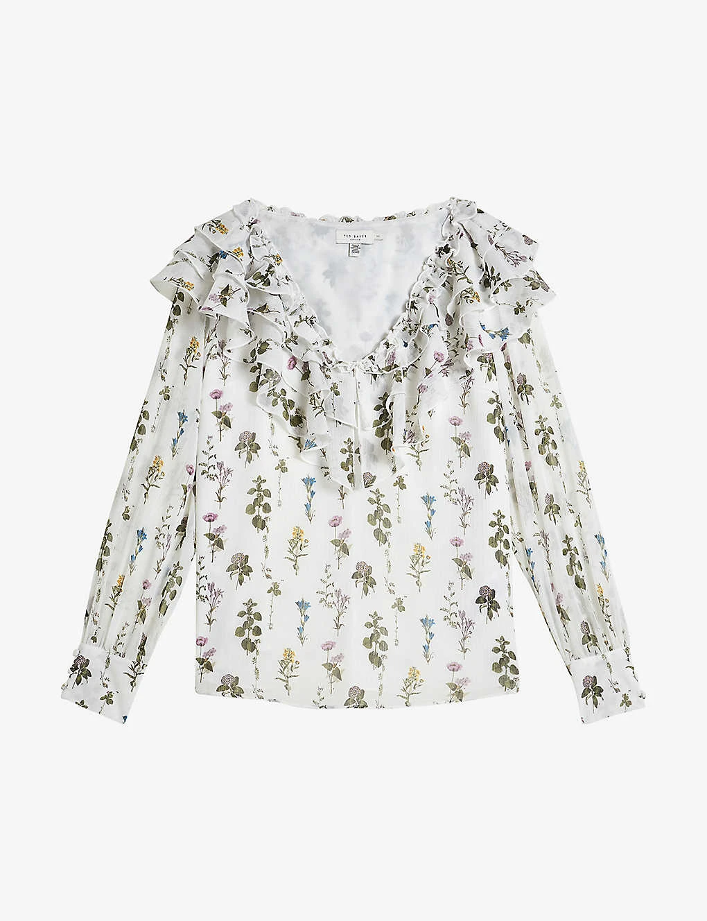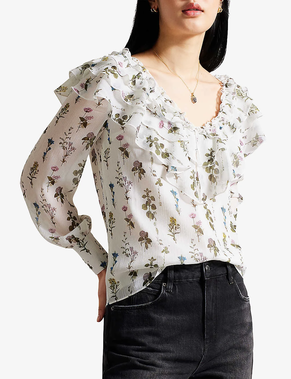 - V neckline, ruffle-trim at the neck, long sleeves, floral print