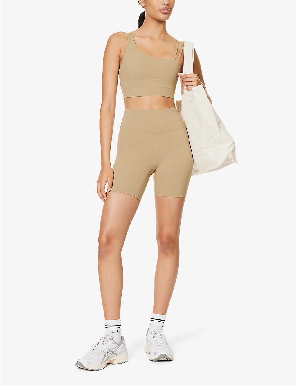 - Slim fit, high rise, elasticated waistband, exposed seam stitching