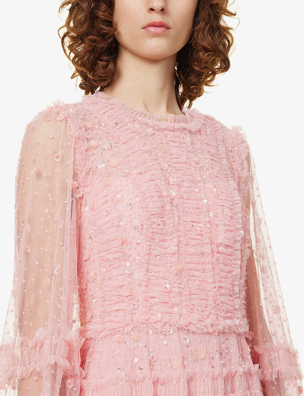 - Regular-fit, round neck, long sleeves, all-over sequin-embellishment and frilled trims, tulle panels, flared skirt, double-layered skirt, fully lined